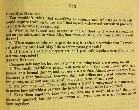 A few weeks ago on a Goodwill treasure hunt, I scored two gems – 1982 Miss Manners and 1952 Amy Vanderbilt Book of Etiquette. a random flip of the pages revealed a good chuckle, another a sigh of relief that some such graces have been relaxed and a small gag when I witnessed the anti-etiquette going on around me. Seriously people.