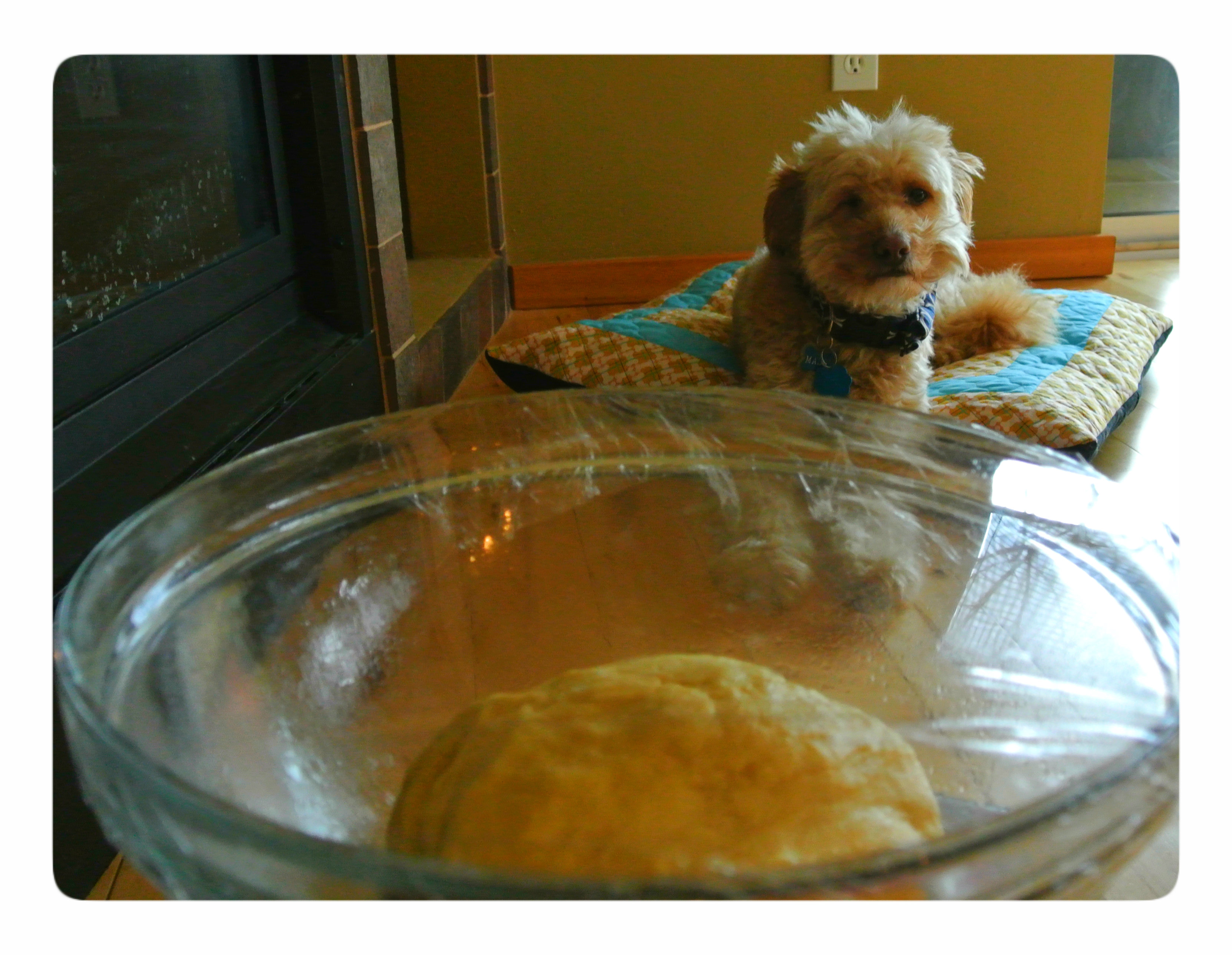 - If overnighting – Cover the dough with a towel and let it rest for 10 minutes. If same daying – place in greased bowl (Pam) and wrap tightly with plastic wrap. Let rise for about 60 minutes, ideally to double in size. Mine did not rise that well but no big gig said the pig. Have your dog supervise the rise…