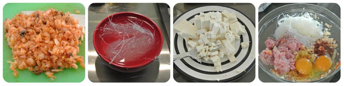 In mixing bowl, thoroughly combine kimchi, tofu, pork, eggs, noodles, red pepper flakes, salt/pepper, sesame oil. Just use the kitchen utensils God gave you! Hands!