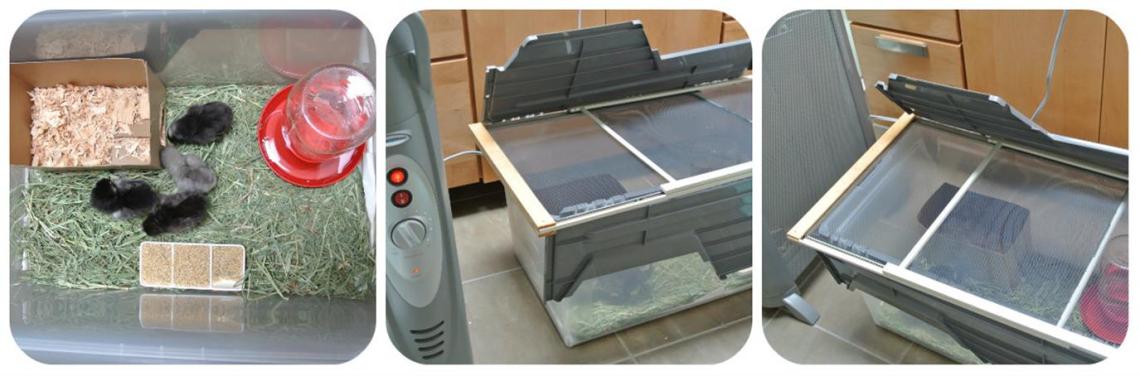 - Safe place (away from the dog and looky-lous). We went with our guest bathroom: tile (sweepable) floor, small (so not too much to heat), skylight (natural light cycles) and water. The sink is a handy place to put them short term while cleaning. We also left the box they came home in sans top for fun. Not usefully but they did play in it for a bit.