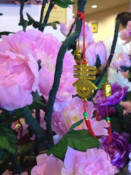 - Admire the décor: artificial pink flowers, gold bobbles, bamboo, fluorescent posters, white boards, fat lucky waving cat and fish tanks.