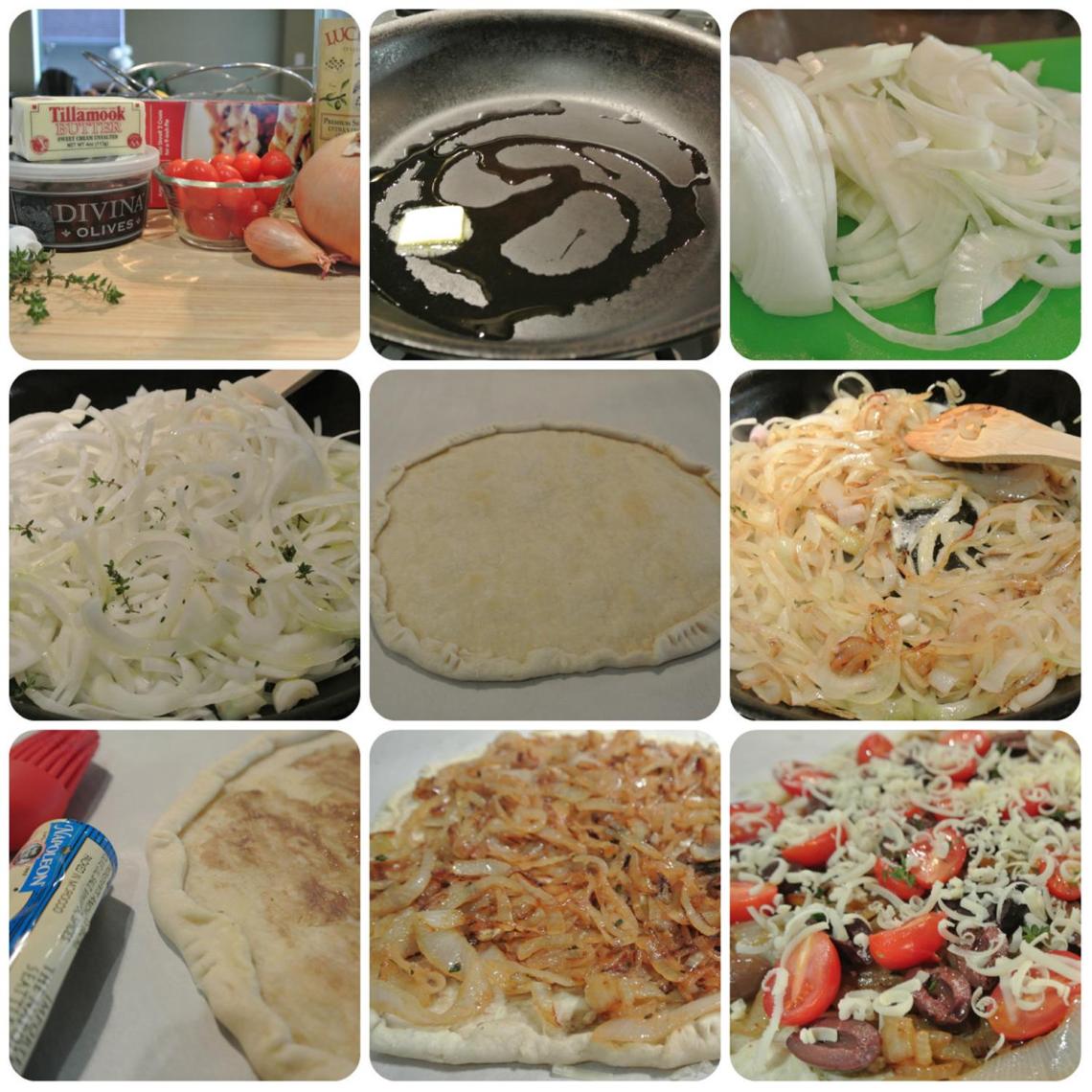 - Arrange onions over crust. Top with olives, tomatoes, some more thyme and anchovies if using filets instead of paste. Add gruyere or other cheese. If you have some onions left over, freeze them!