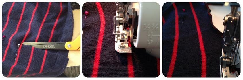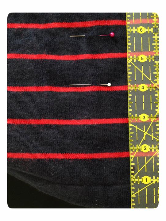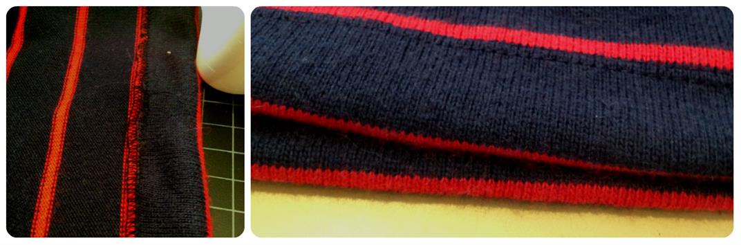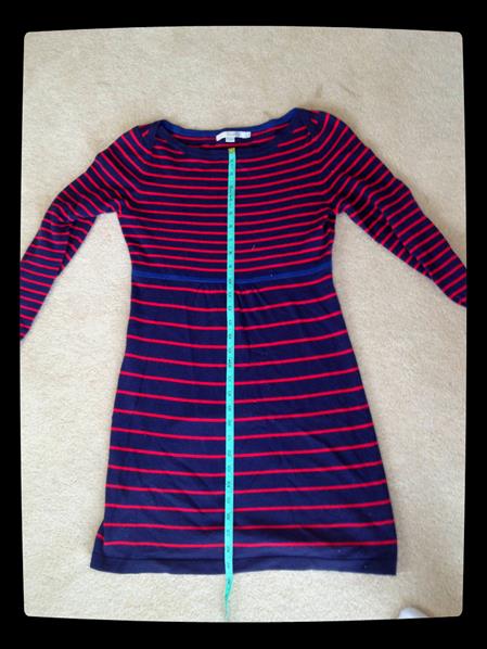 Background: Boden striped sweater tunic dress, but is scandalous short (for me, not flattering) as a dress and too long to wear with skinny jeans. BUT it’s comfy and I love stripes, so decide to shorten it to make it more wearable.