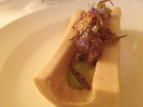 Lamb sweetbreads with caramelized turnips, browned butter, fresh thyme and rosemary flowers (served up in a cleaned out bone on rock salt)