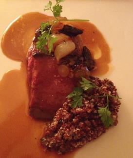 Wagyu beef from Snake River Farms in Idaho, with morel mushrooms and peppercorn sauce served alongside quinoa