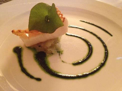 Sea bass (did you know it’s also called sablefish) with arugula puree and homemade ruffle potato chip J on fennel