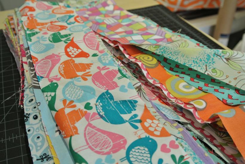 - 2 ½ inch works well and is available pre-cut. In my tutorial I used 3 inch strips in various lengths ranging from WOF (width of fabric) to about 6 inches (the smallest)