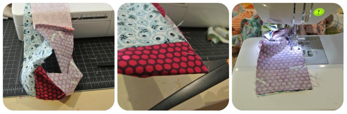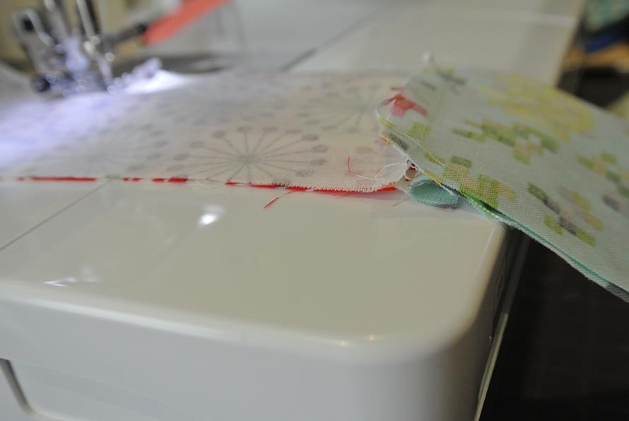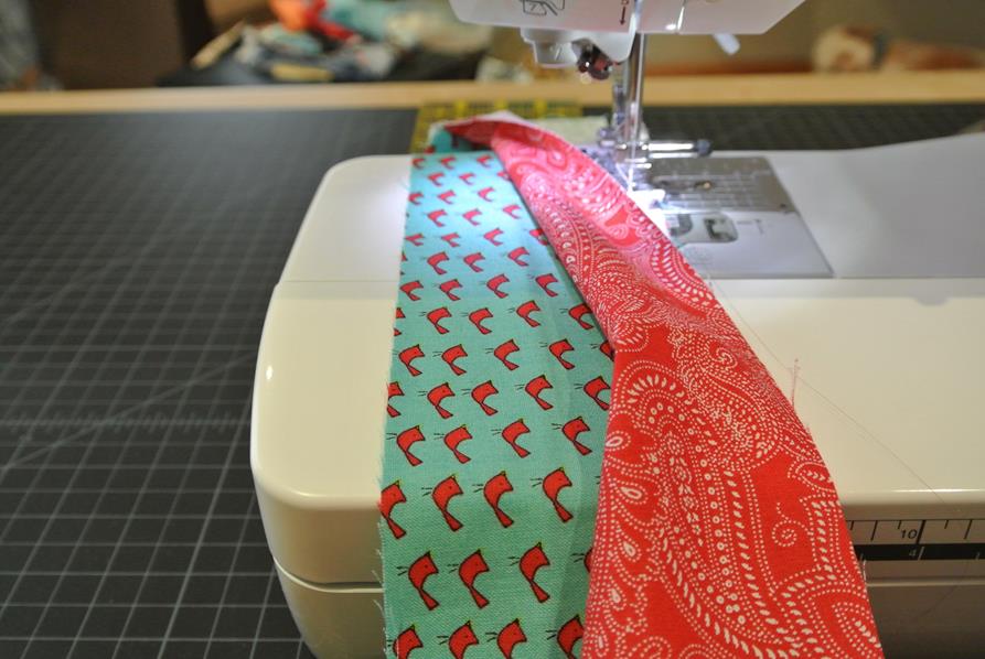 - The first step is to take the short ends, right sides together and stitch. You could do a ¼ inch seam, I just did to the edge of my presser foot, since it is easier and doesn’t matter really how big the seam is as long as it is the same. You could also join them, not straight/perpendicular but on a 45 degree angle, like you might do when creating a binding. Repeat until all pieces are connected end to end into one loooog piece. This is a great way to learn to chain piece. Just keep sewing end to end without clipping thread. Match up right sides each time. See the second photo below and notice how the red and white piece is under the foot with the wrong side up and then flipped up so that wrong side is on the bottom. This is what I mean by end to end