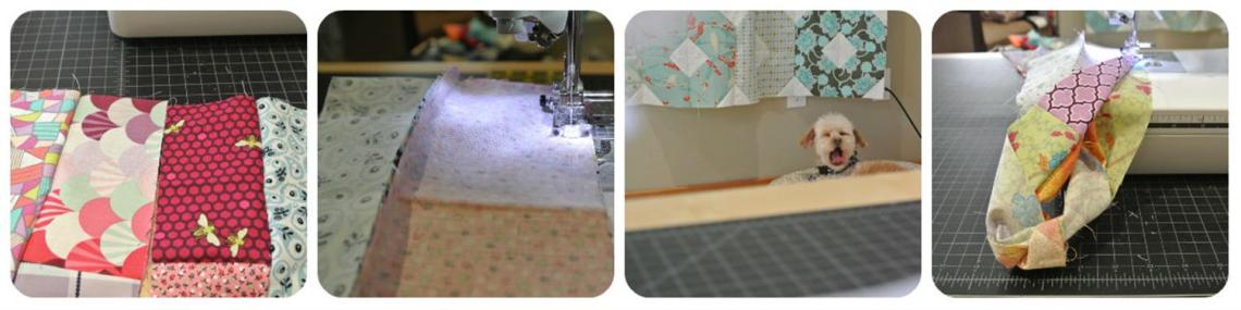 - Sew! Sew! Sew! [Can you see the sleepy dog in the photos? Sort of like Where’s Waldo…] Eat some Peeps! If you have some pieces where two seams meet up, I like to alternate so they lay flat. I sew over pins sometimes too…