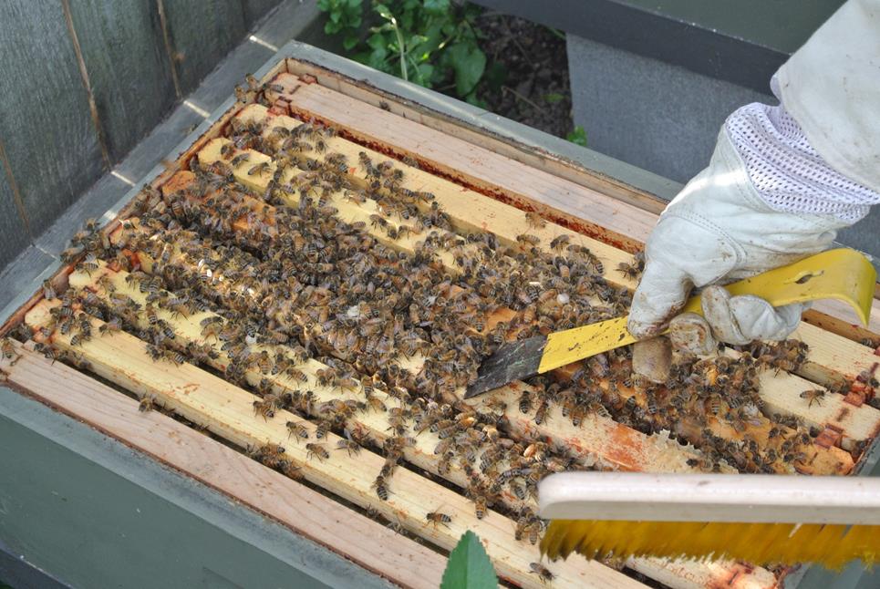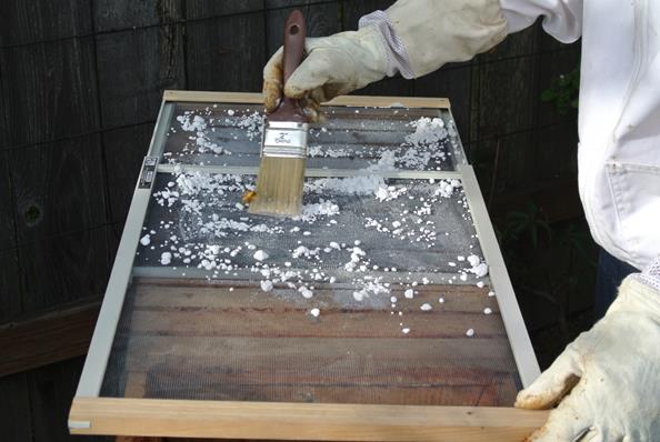 Why do powdered sugar treatments? This is a non-toxic way to prevent mite infection in the hives. Mites can ruin a hive if out of control and it is easy to prevent than treat. The bees can also consume the powdered sugar as food, while they clean each other off. This is really easy and actually calms the bees down and makes it easier in my opinion to close up the hive. Bees are always walking around asking to get squished when you put the frames back or top on. I use a cheap adjustable window screen to place over the hive after I schooch the frames apart a bit, so sugar will fall in. The scoop about a cup of sugar onto the screen and brush through using a paint brush. My powdered sugar is a year or two old and kind of clumpy but worked just fine. Be sure to keep a lid on the sugar container as bees will get stuck in there. Once you brush it though, remove the screen and brush the sugar off the top of frames/bars into the hive, push the frames/bars back together and close up the hive.