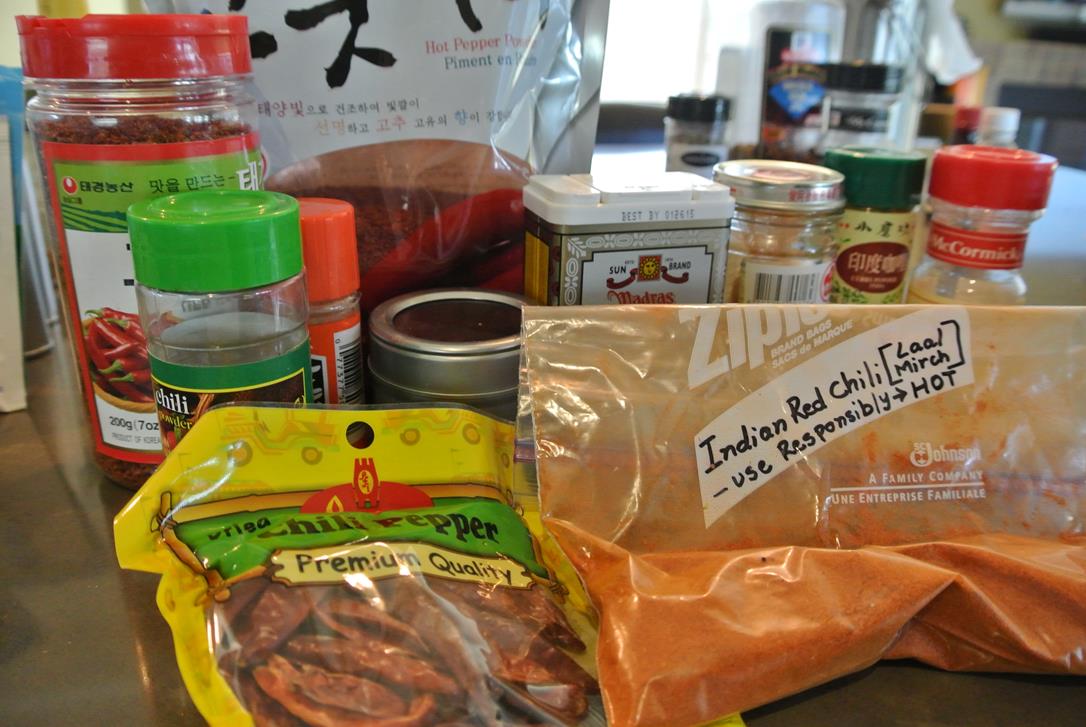 Red pepper powder (big in Korean cuisine, but don’t need a kilo of it), three curries (kept two – 1 is MIL fave and other is Madras, different flavor profile), chili powder (replace), indian red chili (use responsibly!) and Japanese shichimi (yummy on edamame and rice.)