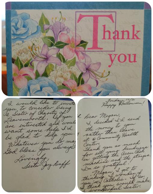Who is Sister Joy Duff? She is a nun that I became acquainted with while on rotation at St. James Hospital in Butte, MT in the fall of 2003. I do not recall the specific instance that I helped her with a blood glucose machines and strips, but likely was a patient assistance program, given reference to the Community Health Center (another great rotation site I still think about and apply learnings from!). However, I have kept her kind note over the years. In re-reading it today, I can still see her kind face and smile at the thought that in her opinion I was possibly worthy of joining the Sister of Charity of Leavenworth. With that I did some searching to see where Sister Joy’s life has lead her. I had forgotten she was also a nurse by training and at the time I met her in 2003, in the role of chaplain/pastoral care for St. James, when I believe she was 70 years old (but I remember her seeming younger). It looks like she is continuing to serve via the SCLS but has since retired from St. James. Below is her profile.