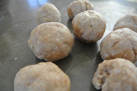 - Knead the dough on a lightly floured surface until it is smooth – just a couple minutes. I found I needed to wet my hands a bit as the dough was a bit dry for me ( I made a half batch). Divide into 10 chunks, or however many chapatis you want to end up with (bigger=fewer, smaller=more). Roll each piece into a ball with your hands and let rest for a few minutes.
