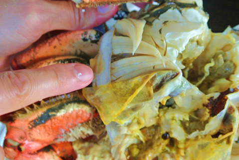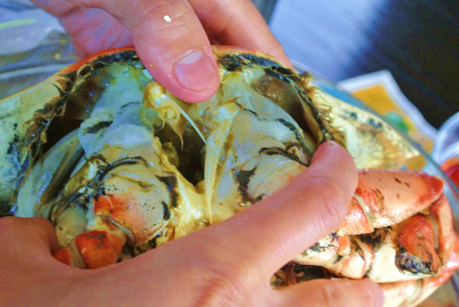 - The goal is to get the legs separate from the head and the innards (“crab brains” – but they are really not brains). Probably no right or wrong way, so I’ll just show you what we did. We composted the entrails but I have tasted a mean fried rice made with that stuff. Just don’t eat the lungs. In the pictures they are the leafy, triangle things. Squeashy…