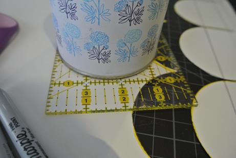 Make a pattern. I used a round tin, scrap poster board, sharpies, paper scissors and a quilting ruler