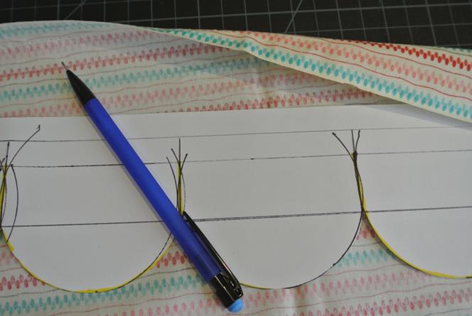 Trace your pattern onto the back side of fabric with a pencil. The point of this is to use the selvedge edges so that they don’t ravel, but there is no reason why you couldn’t use a cut edge and fold over and finish, leave raw, apply bias tape etc. You can see in this close up that will the pattern circles overlap (black lines) I straightened them and use this as a slit so it opens up nice (yellow line).