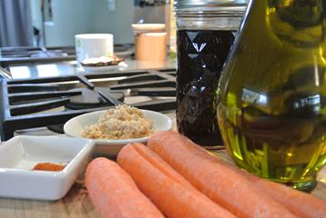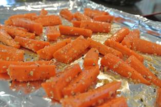 Toss the carrots with olive oil, honey, cayenne and garlic. It is quite easy to put in a clean plastic bag and then shake shake shake.