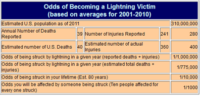 According to NOAA, in 2012, “there were 28 lightning fatalities, 2 more than the 2011 total of 26. The 2012 number still is well below the 10-year average of 37 fatalities. Florida had the misfortune to number the most victims with 5 fatalities […] In 2012, the most dangerous place to be was outside doing chores, walking or engaging in other non-team sports where 12 people died (43%). The next most dangerous place was under a tree where 11 deaths (39%) occurred. Almost 8 times as many males, 25 (89%), as females, 3 (11%), were killed by lightning. The hardest hit age ranges were tweens and teens and adults aged 40-59 […].”