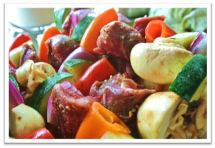 Filet Mignon Skewers with Fresh Veggie Skewers (Turf) & Steamed King Crab Legs (Surf)