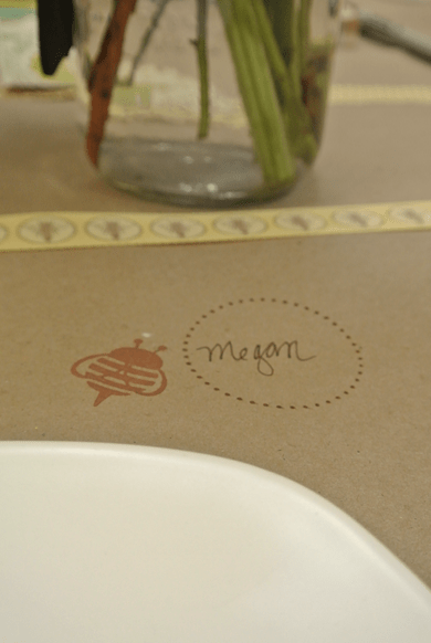 During a recent surf and turf dinner party, I covered the table with brown kraft paper (love!) with ribbon runners. This lead to some fun and easy place card ideas for your next brown paper table party. The combinations are endless and there will be something for every occasion and holiday. Brown paper is clean, a tad rustic, inviting, very accessible and makes for easy clean up. White butcher paper would be an option with all the same benefits as brown paper (think candle lit Italian restaurant).