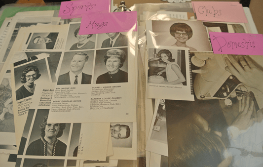 • Old yearbooks – yours or treasures found at thrift shops. I keep the best pages filed by theme in a binder (domestic (think 1950s home ec), mug shots, clubs, social etc)