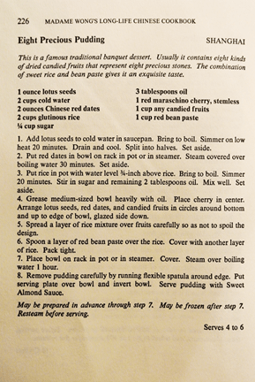 Eight Precious Pudding – This is a famous traditional banquet dessert. Usually it contains eight kinds of dried candied fruits that represent eight precious stones. The combination of sweet rice and bean paste gives it an exquisite taste. [beans are not dessert]