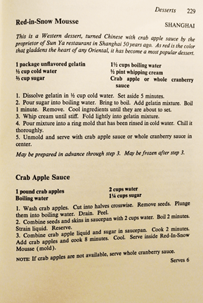 Red-in-Snow Mousse – This is a Western dessert, turned Chinese with crab apple sauce by the proprietor of Sun Ya restaurant in Shanghai 50 years ago. Red is the color that gladdens the heart of ant Oriental, it has become a most popular dessert. [as mentioned, sounds a wee bit communist and likely the represents two of the few crab apple recipes out there.] Involves a Jell-O mold so you now its legit.