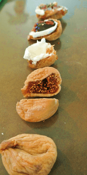 - Open and flatten the fig half to form the base of the “bite”, skin will be down and inside fruit and seeds showing on top