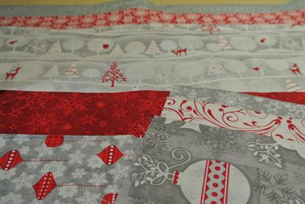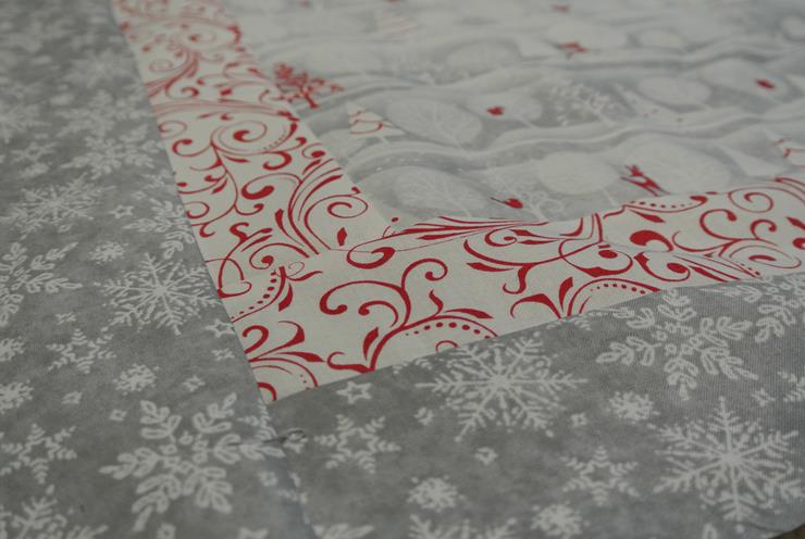 The Christmas Holiday theme around our house this year is red, gray and white. This tutorial guides you through a speedy, yet undeniably cozy, lap sized quilt, perfect for napping and decorating the back of a sofa or chair. This quilt is all about the central focus fabric, accentuated with three simple freehand geometric applique trees. The trees would be completely optional and likely depend on the fabric you chose for the center. You could also applique on large simple silhouettes of ornaments, snowman, candy canes, stars or packages or perhaps more intricate reindeer, snow flake or angels. North Pole’s the limit. Fabric is primarily from the Henry Glass Holiday Frost line.