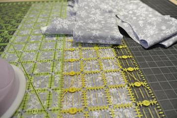 - Cut the binding strips. I like to use 2 ½ wide strips, joined on the diagonal (need 5-6). You can use all one fabric or scraps etc.