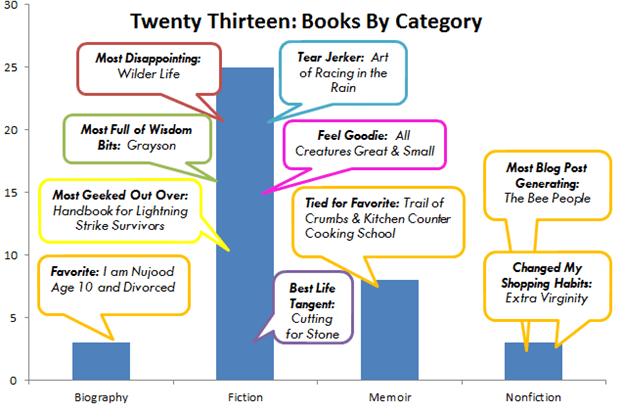 I really love graphs and reading and graphs about reading! This past year has been a great year for me on many levels, but one facet I am quite proud of is my blog. I posted more than 150 original entries this year on, as expected, a variety of topics: Coop to Craft. Hive to Home….. Among these ramblings are book reviews. I am not a literary genius or professionally trained reviewer (in case I had you fooled J) but I do love to read and always have. I also love competitions, and remember really plowing through the pages for childhood reading contests. Now, I must find the drive from within, and it is my commitment to you, my blog readers, casual or declared, that I share what I have read with a twist: either a wine-o foodie-esque quip, favorite quote, favorite moment or a life story tangent.