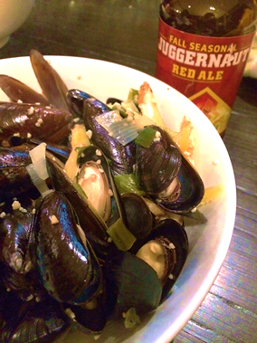 - 2 lbs live mussels, scrubbed and “debearded” [note: 2 lbs made for enough for two full entrées, so you could serve 4-5 as appetizers); clams would work too