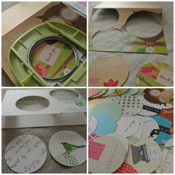 • Using a paper punch or scissors or other cutting implement – making your journaling papers. There are so many large paper punches that would work great. You could also just use sticky notes or other scrap paper – but its fun to be fancy! It is a-ok to use the part of the card with writing on it too… maybe even nicer!