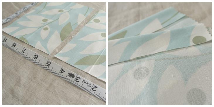 • Prepare the top of the journal jar. Cut two pieces of fabric the same size. Mine were each about 4 ½ x 6 ½ inches. Iron the fabric and press about an inch down on the long side. This will make the slot for the card circles.
