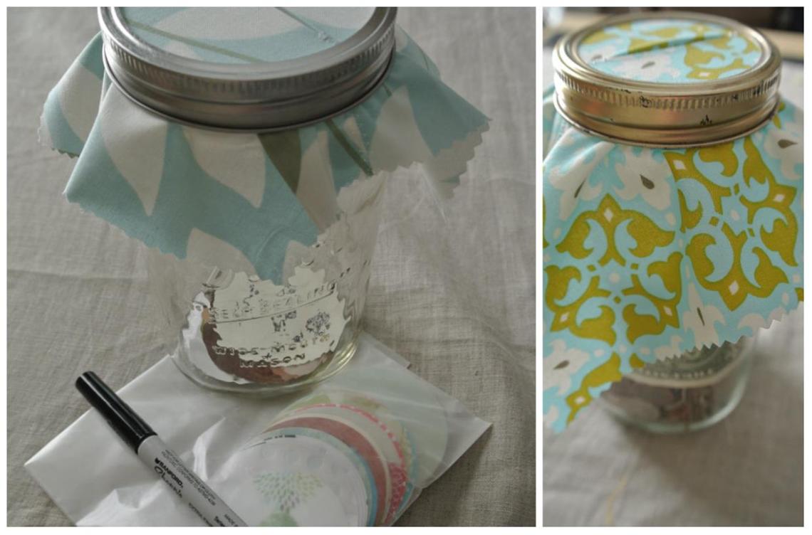 • Place the fabric on top of the jar mouth and screw on the lid ring. Tug on it to center and make taught. Viola! Now fill it with gratuitous thoughts! Or coins, if you made it a bank, or maybe both? Penny for your thoughts…..