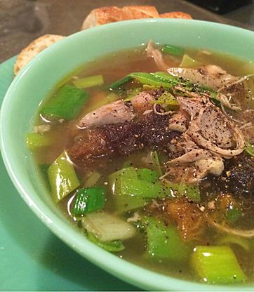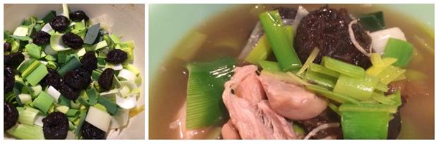 - Pour the strained broth back into the same pot. Chop the white portion of the leaks add to the broth, add the prunes/dried plums and shredded chicken. At this point you can refrigerate it to serve later, or heat for about 20 minutes to warm everything through and soften up the prunes. I tried to mush up the prunes a little bit to release their magic. You should taste again to see if the soup needs more salt.