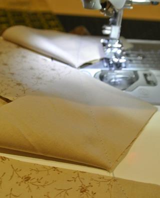Sew together each row. The tricky part is that you need to line up the pieces and create a “dog ear” (about ¼ inch) on each end so that when you open up the pieces they are even along the bottom. This is because you are sewing at an angle and the pieces alternate having the wide part on top.