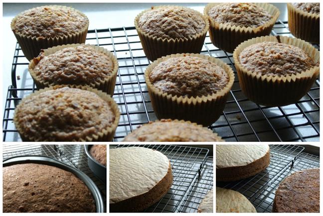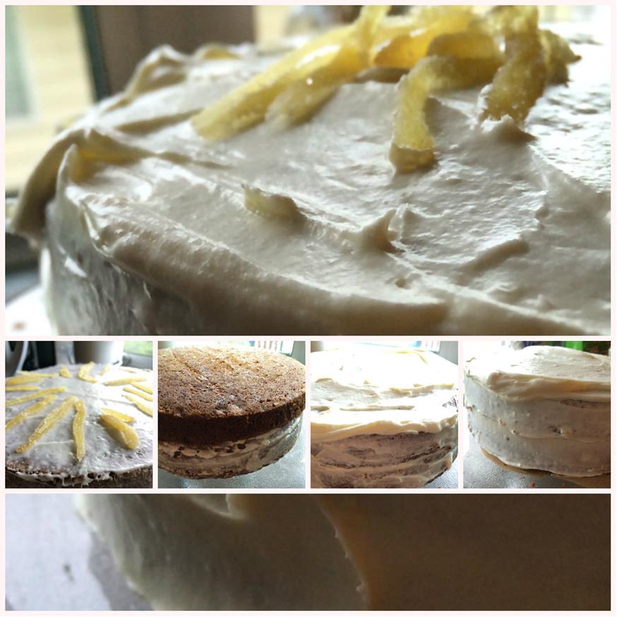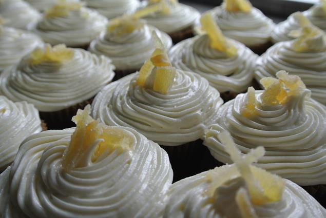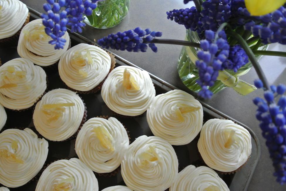- Frost in your favorite way. I leveled off the layers, did a crumb coat and then frosted the whole cake, placing candied ginger in between the layers and on top, when all done. You could top with toasted nuts etc. To do a crumb coat, scoop out about a cup of frosting into a separate bowl and then thinning frost the bottom layer, then add a thicker layer of frosting in the middle, place the top layer and then repeat with another thin coat. This helps you keep the crumbs out of the final frosting. Wipe off you spatula or knife and then frost the rest of the cake. You will have frosting left over. Put in the fridge or mix with the cut off part of the cakes. For the cupcakes, there will be very little remaining frosting. I used a pastry bag to pipe on the frosting which made the whole process really easy.