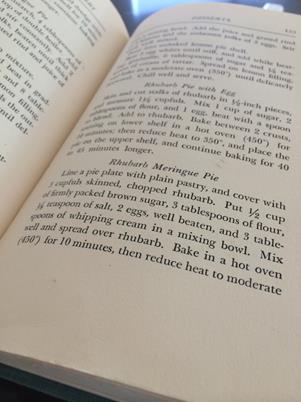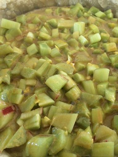 This is a seasonal rhubarb recipe that is a departure from the standard and delicious rhubarb crisp or jam. Decidedly different, this recipe uses a generous amount of this ambidextrous vegetable. Although some varietals still have the poisonous leaves, many modern varietals have edible leaves. However, most recipes just use the petioles or stalks (celery looking part). The original recipe calls for peeling the stalks. Granted this recipe was found amongst the pages of my 1950s Odd Volume of Cookery, I nonetheless set about peeling, besides it was for Mother’s Day and they are worth the effort. I also added fresh ginger and some cinnamon to the original recipe.