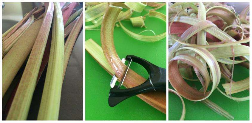 - Peel (if you want) and thinly chop the rhubarb (thinner than my picture I think).