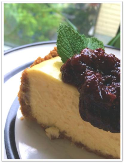 Amazingly good, not complicated and well worth the from scratch effort. Besides a homemade cheesecake really is the most respectful thing you can do for the strawberry sauce after all. Thank you to Tyler Florence and the Food Network. Here is the link to their recipe. No sense in me repeating this one…. I made it as directed, save for the sauce. The cinnamon in the crust is a must and be sure to choose a good full fat cream cheese and sour cream – none of that fake low fat business. Mine turned out a bit yellow, because my hen’s eggs have such vibrant yolks.