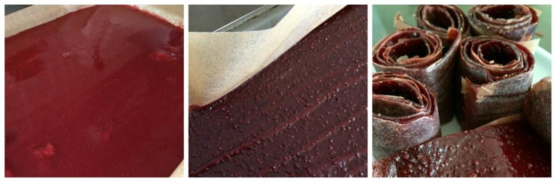 - Pour the berry slurry into a jelly pan lined with parchment paper (go well up and over the sides) and spread evenly.