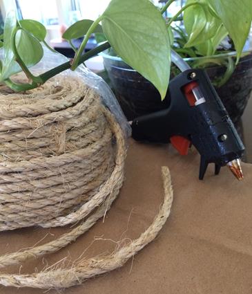 - To wrap the sides, glue down the end of the rope to the pot then start wrapping. I overlapped the rope slightly when all the way around the first time to hide the start. I glued a lot more at the base to get is secure so that I could wrap it tighter and quicker going up. Do not overdo the glue, you don’t need every inch attached. Wrap and glue. Wrap and glue.