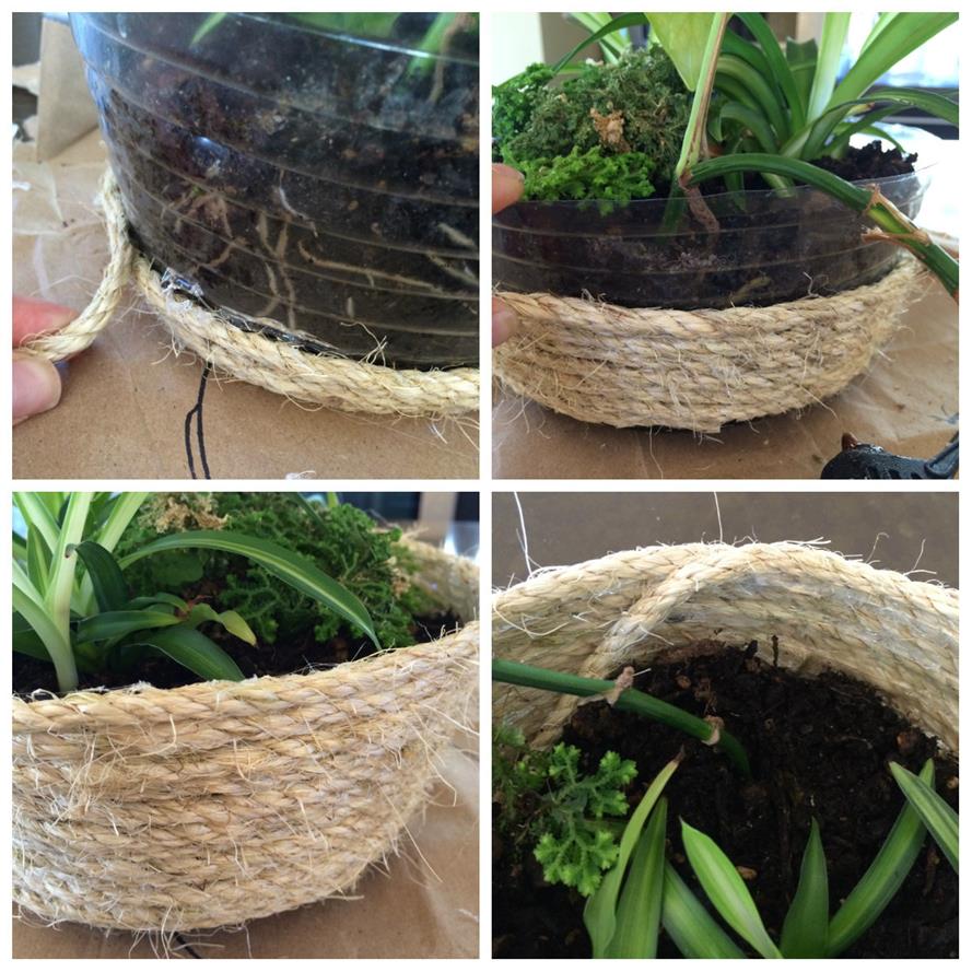 - Decide if you want to cover the base of the pot. I covered the base on one of the three but not the others, in part because I would have needed more rope and it is not visible in the area I am using.