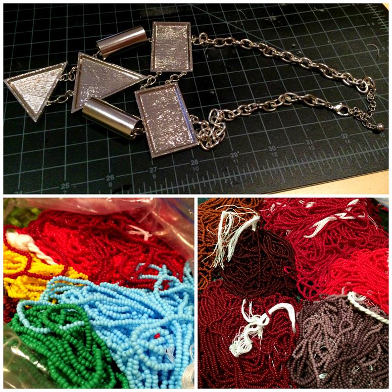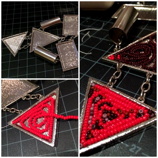 - Initially my plan was to place cut-to-fit fabric scraps and epoxy in each of the shapes but decided to go with supplies on hand. Enter my big bag o’beads. Such vibrant colors! With a black summer patio party dress in mind, I narrowed down my colors and decided to go for regal red and purple theme, with tan, dark brown and maroon accents.