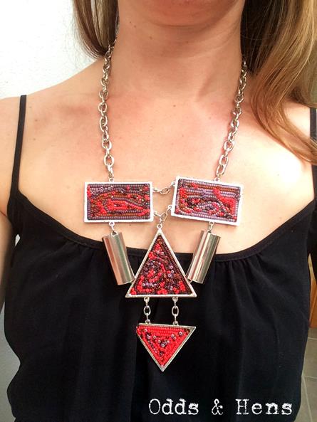I always keep my eyes peeled for statement necklaces, I suppose you could say they are my ‘thing’. Jazzing up basic objects does not have to be complicated or require much beyond glue, courage and some bits and baubles. This beaded necklace took me all of about an hour to make, longer for glue to try and cost probably less than $10. I picked up the silver necklace at H&M about 2 years ago and the seed beads I have had for years, a yard sale treasure scored by my mother.