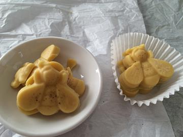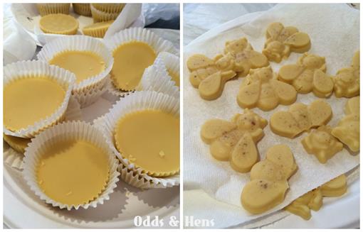 I also had a small bee candy mold that I used to make adorable lotion bees. I tried spraying the mold with non-stick cooking spray and also without – didn’t seem to make a difference. For any lotion bars that are funny shaped or broken or many just bits on the rim of the muffin pan, put it back into the slower cooker and re-melt.