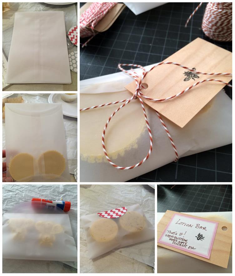 Wrap them up in a small box, lined paper, dish, glass jar etc. I packaged mine up in pairs using vellum envelops, labels, bakers twine, glue stick and some finishing flare. Two important things to note 1) these begin to melt quickly in your hands (that is what makes them lotion bars) so don’t handle them too much 2) whatever you wrap them in should resist oil (e.g. parchment paper, wax paper, plastic wrap) or it will just soak through. Now give the gift of soothed skin.