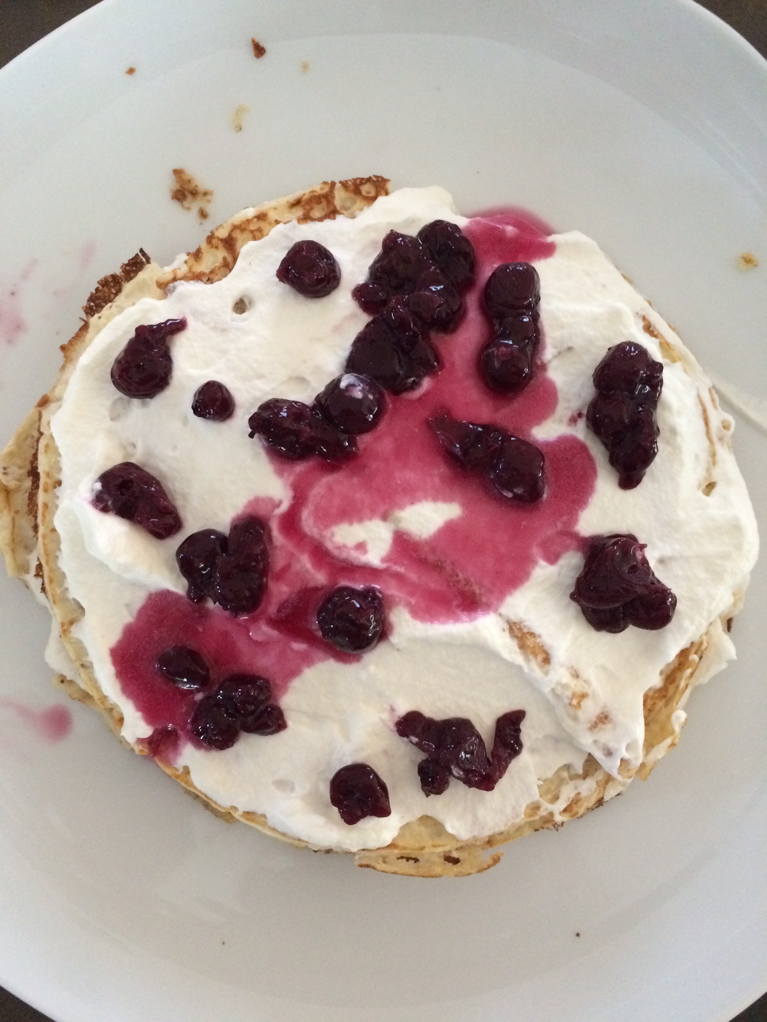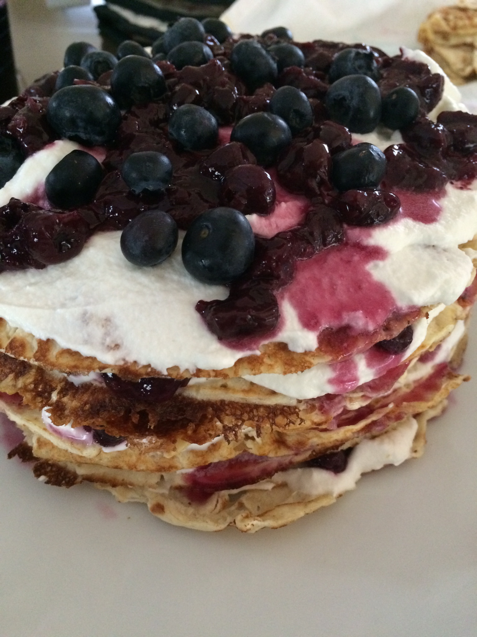 Stack cakes – yum. Oft made with fresh crepes or grandma’s secret pancake recipe. Today I present my quick version featuring pannkakor (swedish pancakes) from IKEA with home-canned organic free range blueberry filing and cointreau whipped cream. Fruit and cream stack cakes are great for a special brunch or dessert at anytime of day (remember life is short). You can amp up the sweetness by using a more jammy or compote-y filling or by whipping up the cream, folding in mascarpone or yogurt/creme fraiche and additional sugar. I didn’t really measure and you shouldn’t either, just have fun.