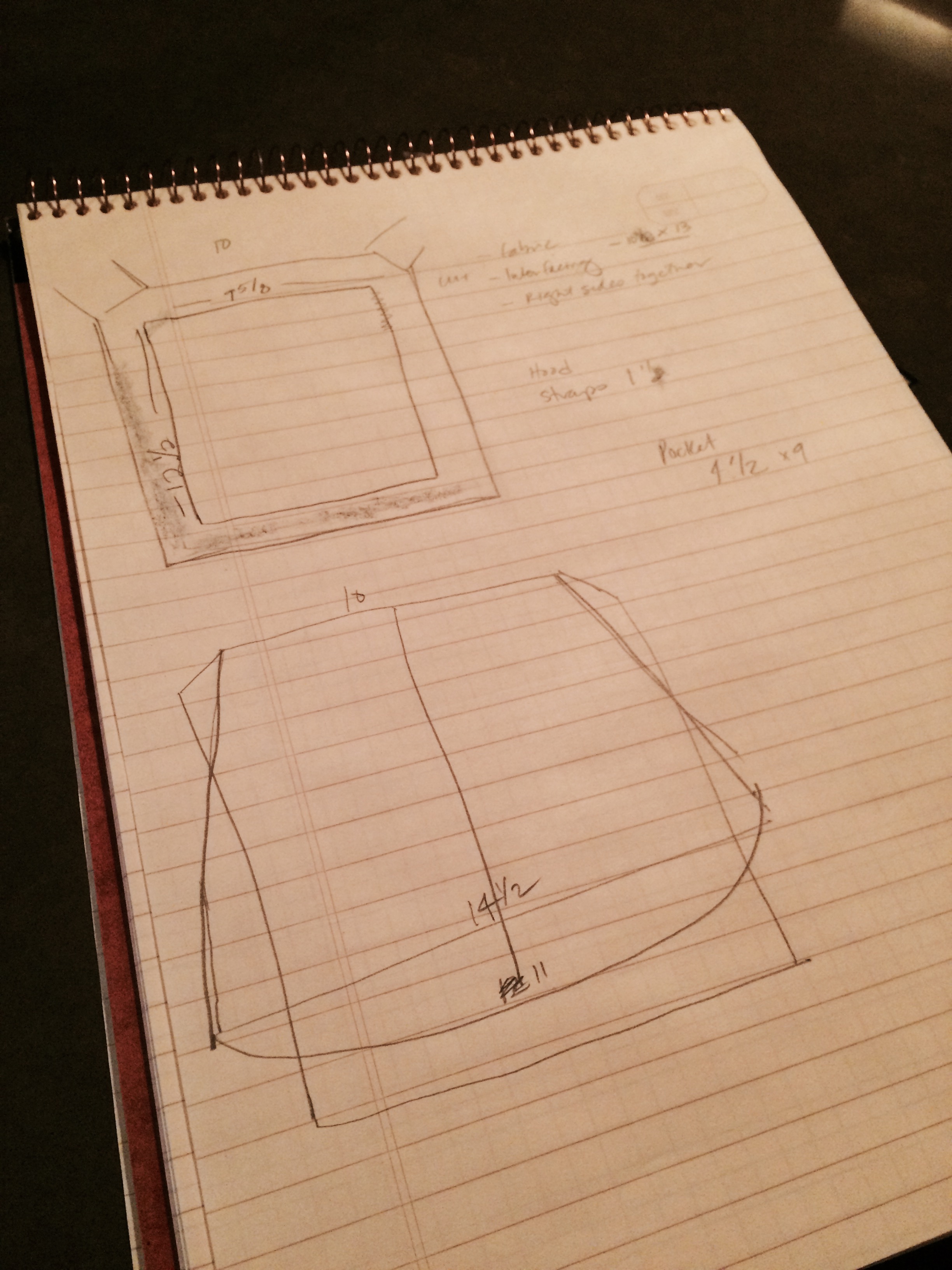 - For the hood, I sketched out a trapezoid of sorts with a rounded bottom edge. It was 10 inches at the top, to fit the space between the straps and about 11 inches long and 15 inches wide. I cut it from two fabrics (rain drops and a coordinate).